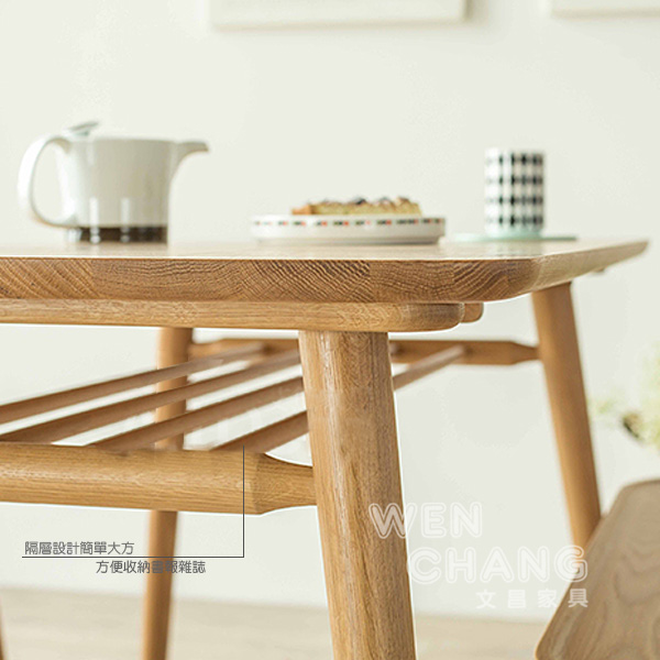 桌面圓弧設計,讓邊角更柔和;下層置物空間可放雜誌、餐墊、籃子等,