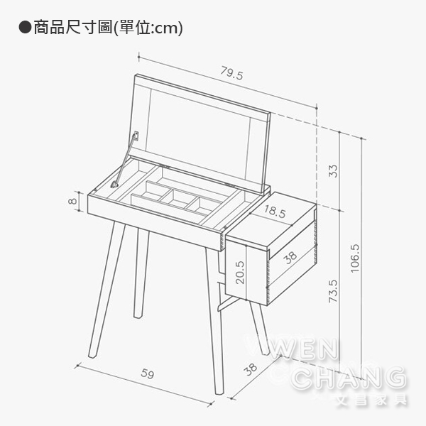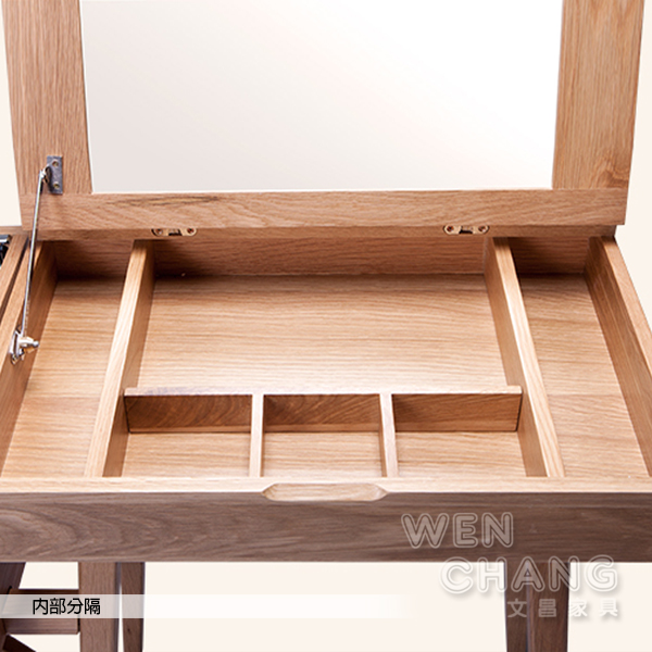 桌面掀開即是化妝鏡,下方收納格可放置飾品、化妝品、文具等;