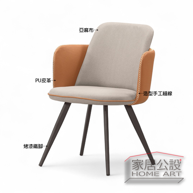 曼特寧多色拼接餐椅,突破傳統單色設計,以亞麻布+PU皮革異材質拼接,