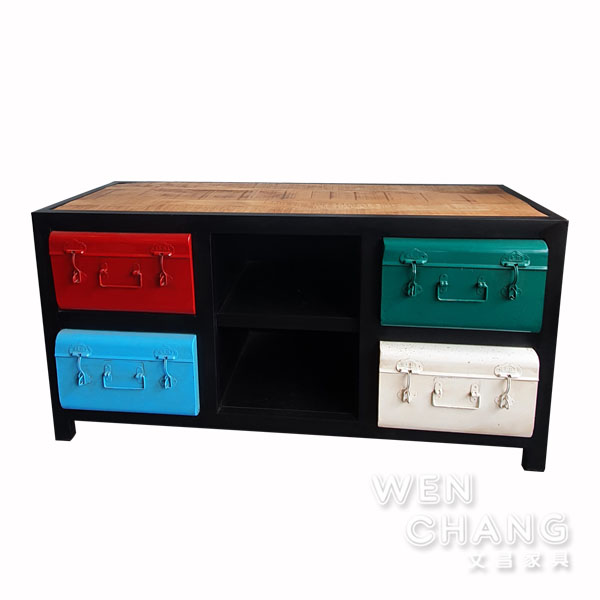 這款電視櫃以經典的 LOFT 倉庫風格為靈感,將四個色彩繽紛的「復古金屬工具箱」鑲嵌進沉穩的黑鐵骨架中,頂部再覆蓋上天然的印度芒果木,粗獷中帶著細膩,絕對是來訪親友第一眼就會注意到的話題單品。