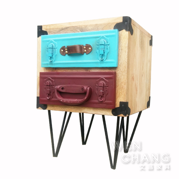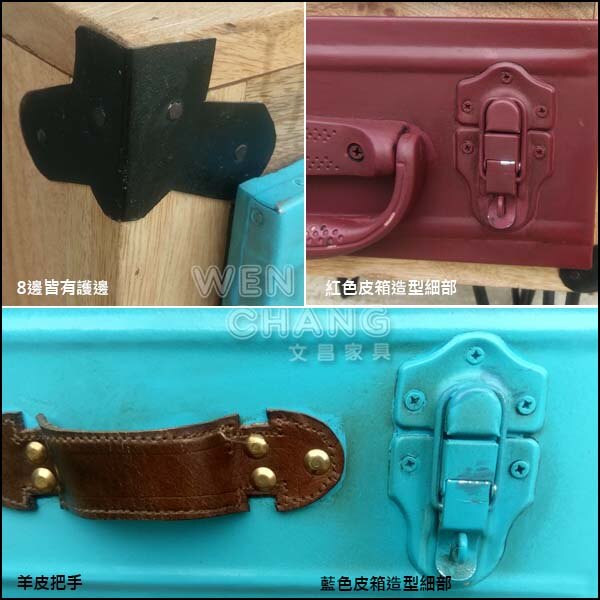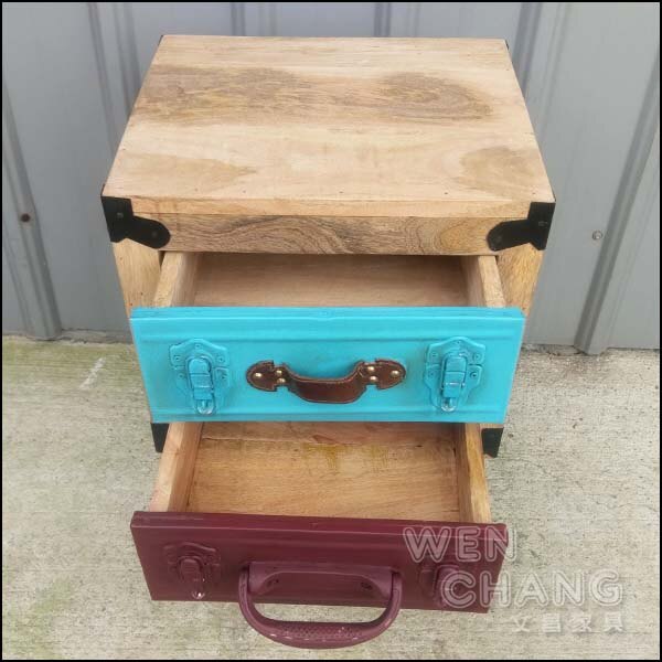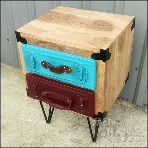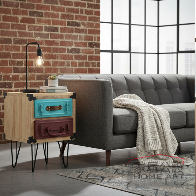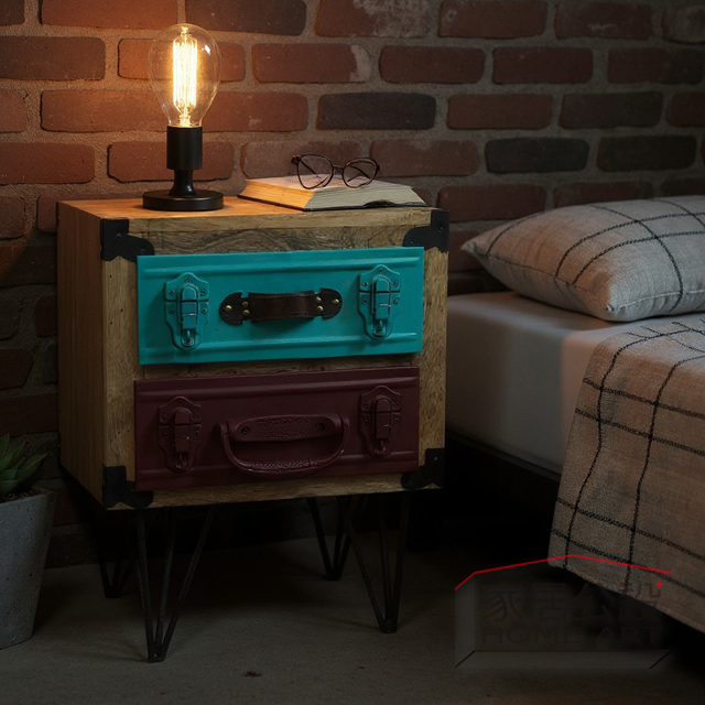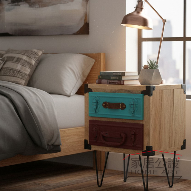 【希特】復古皮箱床頭櫃完美揉合了異國情調與 LOFT 工業風格。大膽的撞色抽屜面板(土耳其藍與復古酒紅),配上逼真的羊皮把手與金屬鎖扣,彷彿隨時準備拎起行囊踏上旅程,讓原本單調的角落瞬間充滿活潑的生命力。