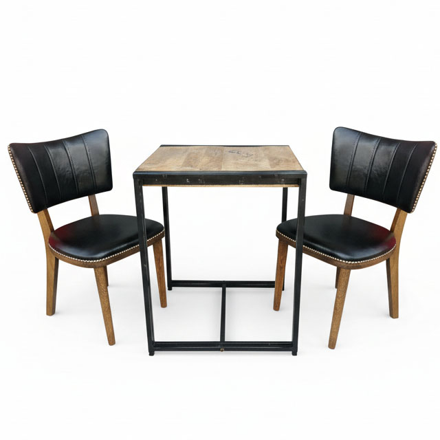 以俐落的鐵件希特餐桌為主體,搭配復古皮革餐椅,整體比例精準、風格成熟,特別適合小坪數住宅、窗邊角落,或想要一個專屬兩人用餐/工作空間的你。