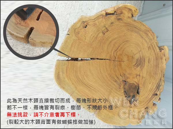 天然的整顆木頭直接痕切的實木塊,不做任何的修飾,