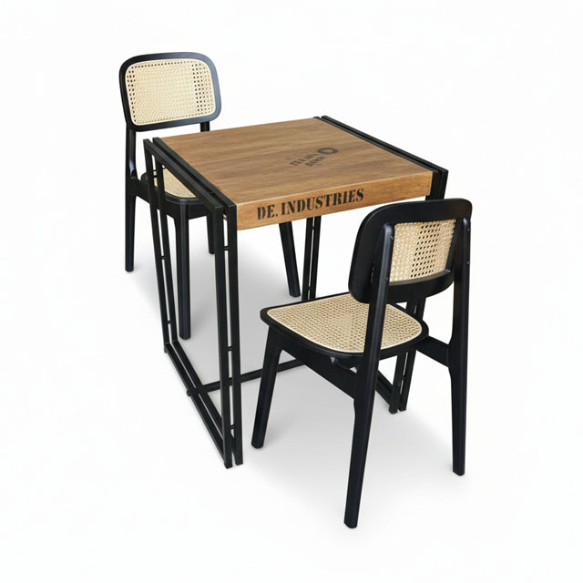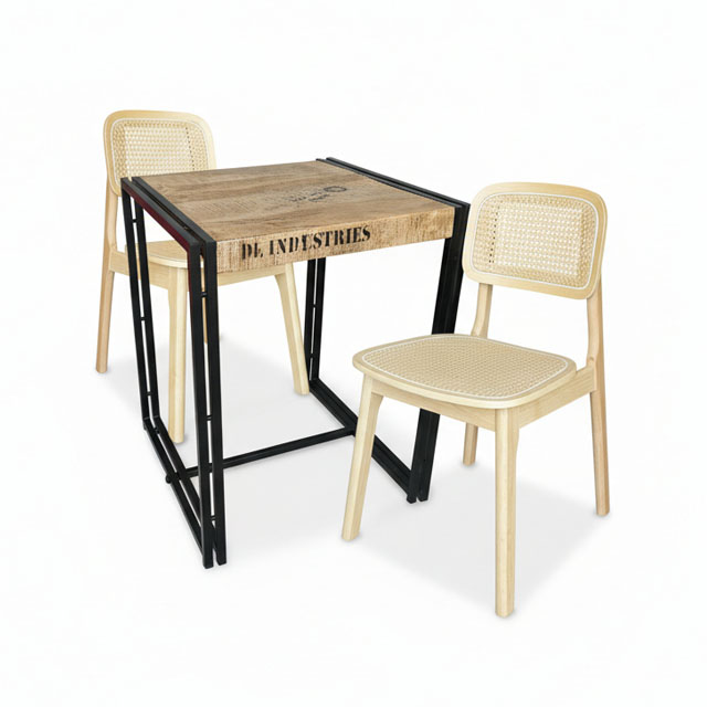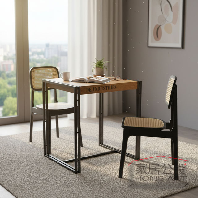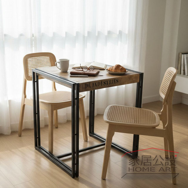 這組以工業感希特小餐桌為主體,搭配藤編餐椅,透過黑色鐵件、自然木紋與藤編肌理的對比,呈現低調、安靜卻耐看的侘寂風格。
